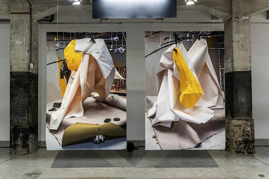 The installations are made of everyday materials such as carpet, vinyl, elastic, garbage bags, clamps and wires. Their meaning is taken out of context, and turned inside out, neutralizing the materials and making them as pristine, as marble or paint. Only to be miraculously brought back to new life in the artwork.